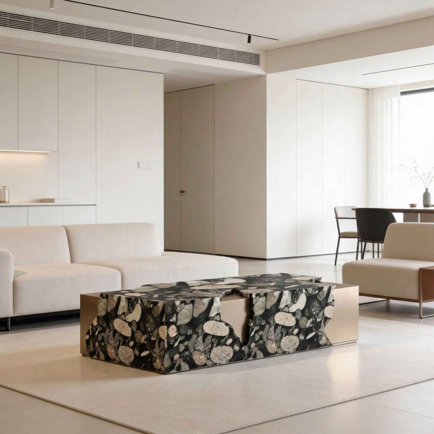 Mehrere präzise geschnittene Marmorplatten, harmonisch komponiert zu einem fesselnden Designobjekt. Handgefertigt nach italienischer Meisterkunst - mit goldfarbenem Metallgestell und natürlichen Maserungen für zeitlose Eleganz im modernen Wohnbereich.