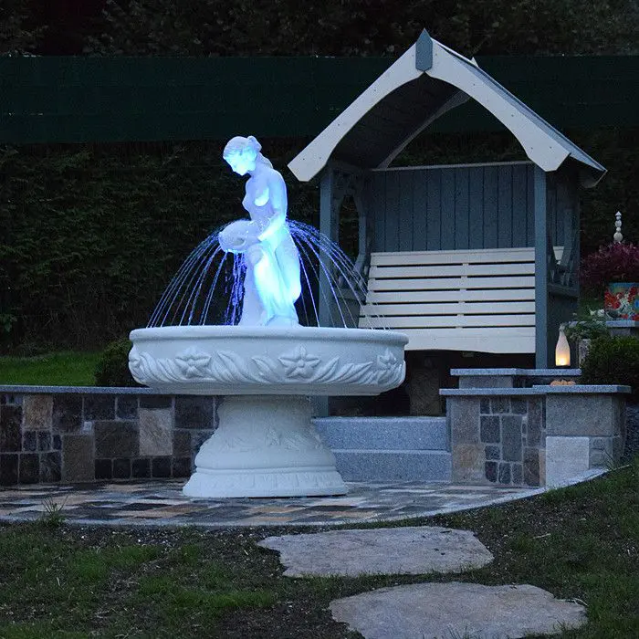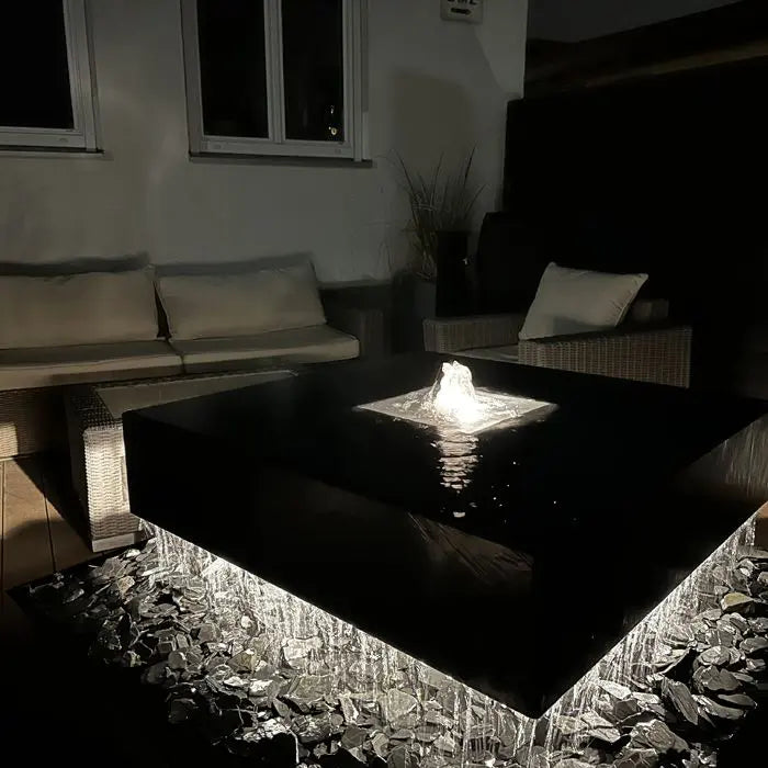 Beleuchtung optional: ohne Beleuchtung // 1x Beleuchtung Wasseraustritt warmweiß // Beleuchtung 4x Innenseiten Quader + 1x Wasseraustritt warmweiß |