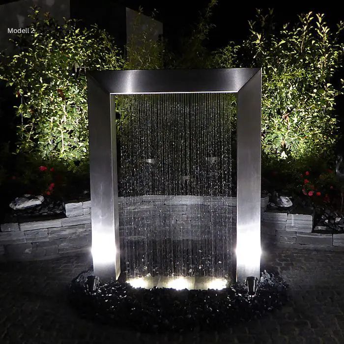 Das Wassertor aus Edelstahl ist ein moderner Edelstahl-Gartenbrunnen mit elegantem Wasserfall, der Garten, Terrasse oder Poolbereich stilvoll aufwertet. Gefertigt aus hochwertigem, witterungsbeständigem aus Edelstahl überzeugt dieses Wasserspiel für den Garten durch klare Linien, ruhigen Wasserfluss und integrierte LED-Beleuchtung. Die Serie ist in drei Modellen mit unterschiedlichen Größen erhältlich und lässt sich flexibel an verschiedene Außenbereiche anpassen. Ideal für alle, die einen langlebigen Edelstahl Wasserfall mit starkem Design-Fokus suchen.