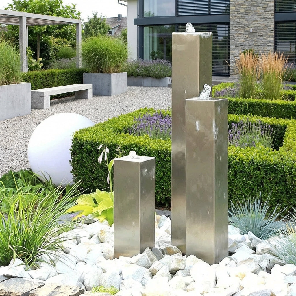 Unsere eckigen Säulenbrunnen in V4A Edelstahlausführung bestechende durch ihre puristische, quadratische Geometrie. Die angebotenen Sets beinhalten jeweils drei Säulen mit variablen Dimensionen pro Modell – ideal für individuelle Gestaltungskonzepte. Die geschliffene und polierte Oberfläche vermittelt edle Hochwertigkeit und minimiert gleichzeitig Schmutz- und Kalkablagerungen. Ein zeitloses Designkonzept mit funktionaler Eleganz.