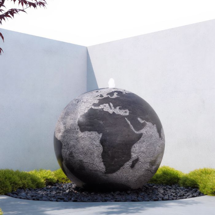 Fontaine sphérique de jardin, pierre bleue, carte du monde