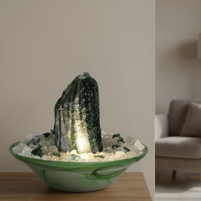 La fontaine en pierre précieuse Fuchsit est une fontaine d'intérieur exclusive ornée d'une magnifique pierre verte de Laponie, dont la teinte intense confère à la pièce une fraîcheur naturelle et une profondeur visuelle. Fontaine décorative en pierre précieuse, elle allie le doux clapotis de l'eau à la qualité des pierres naturelles, créant ainsi une ambiance harmonieuse dans votre espace de vie.