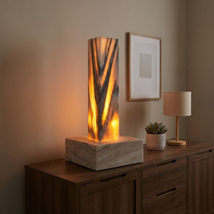 Le point fort de la fontaine lumineuse Sölker Marmor Romantique réside dans sa colonne translucide en marbre autrichien. Le soir venu, elle crée de magnifiques jeux de lumière dans votre intérieur. Cette fontaine est idéale pour quiconque recherche un accessoire de décoration exclusif.