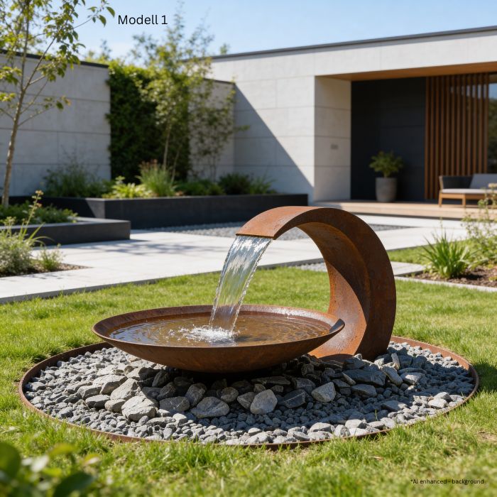 Diese moderne Gartenbrunnen-Anlage besticht durch durchdachte Bauweise mit einer eleganten Wasserschale und Cortenstahl-Wasserfall, die eine perfekte harmonische Einheit bilden. Das geschlossene Einkreislaufsystem mit leistungsstarker Oase-Pumpe (6.500 L/h) ermöglicht dauerhaften Wasserlauf mit minimalem Wartungsaufwand – überschüssiges Wasser wird automatisch über einen Überlauf zurück ins Becken geleitet. Der edle Cortenstahl entwickelt eine natürliche Rostpatina, die dem Brunnen nicht nur seinen charaktervollen Look verleiht, sondern ihn auch langfristig vor Korrosion schützt. Die unsichtbar integrierten Komponenten wie Pumpe und Wasservorrat gewährleisten eine aufgeräumte, ästhetische Gartengestaltung.