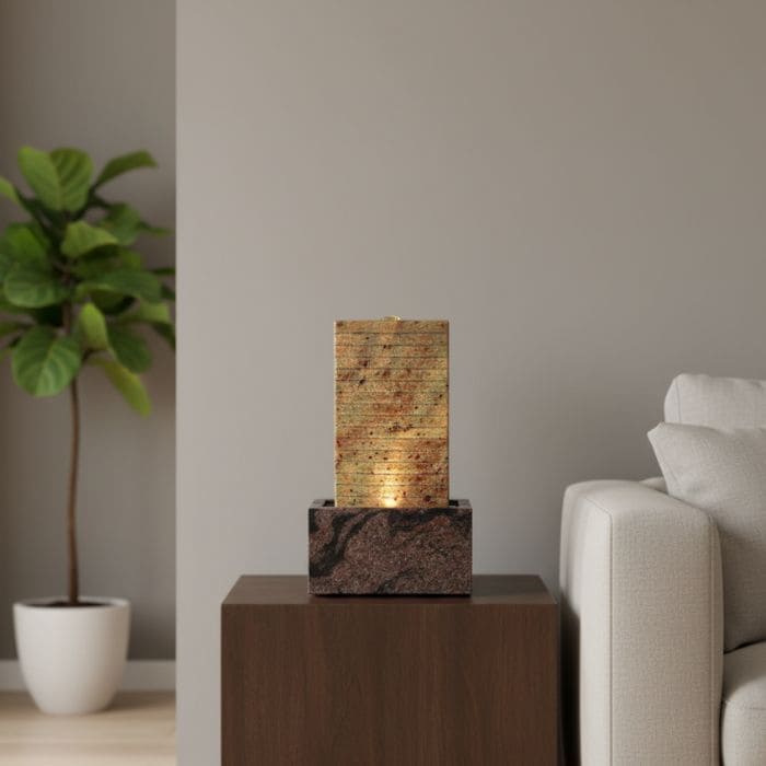Die Wasserwand Shiva Kashi Small ist ein eleganter Zimmerbrunnen aus indischem Shiva Kashi Granit, der dank handlicher Maße und natürlicher Farbgebung in moderne wie klassische Wohnräume harmonisch integriert werden kann. Das sanft über den Quellkörper fließende Wasser sorgt für ein beruhigendes Ambiente und verbessert zugleich das Raumklima.