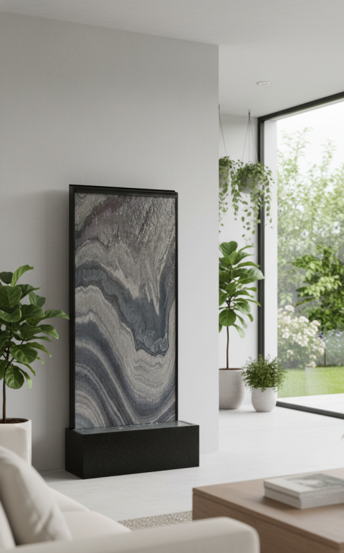 Diese Wasserwand ist wie alle Wasserobjekte in diesen Dimensionen zu 100%handgefertigt. Die perfekte Symbiose von Material und Technik garantiert  vollendete  und dekorative Wohnraumbelebung. Das Wasser fließt im regelmäßigem Kreislauf und erzeugt somit spürbare Luftfeuchtigkeit. Durch die große, permanent vom Wasser bedeckte Fläche reinigt diese Wasserwand auch die Raumluft. Staubpartikel werden angezogen und einfach weggespült.